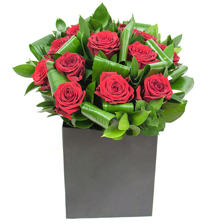 Adorn your home with our exquisite bouquet, featuring vibrant red roses, lush aspidistra leaves, and elegant ruscus. This unique arrangement exudes both style and grace, perfect for any occasion.